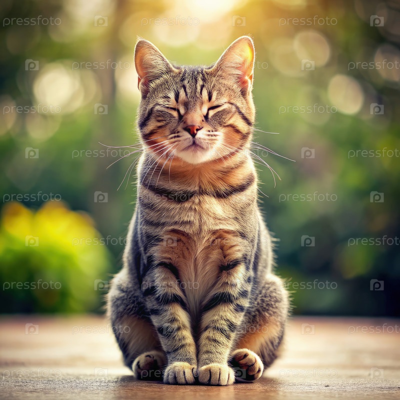 Расслабленная кошка, мирно медитирующая в спокойном открытом саду при закате солнца