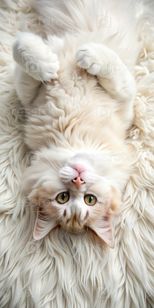Пушистый белый кот мирно лежит на спине, наслаждаясь уютным моментом на мягкой текстурированной поверхности в течение дня