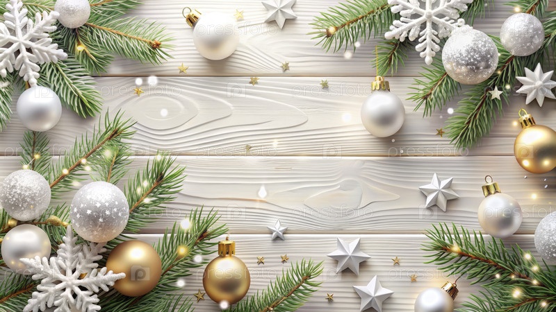 Красивый белый рождественский фон с украшениями и вечнозелеными ветвями для праздничных торжеств