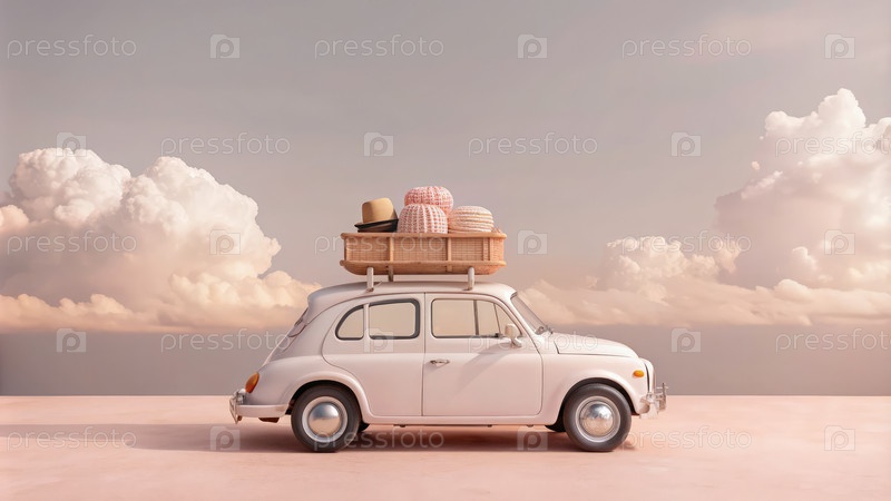 Классический автомобиль с багажом на крыше идеально подготовлен к незабываемым летним каникулам на спокойном фоне пушистых облаков