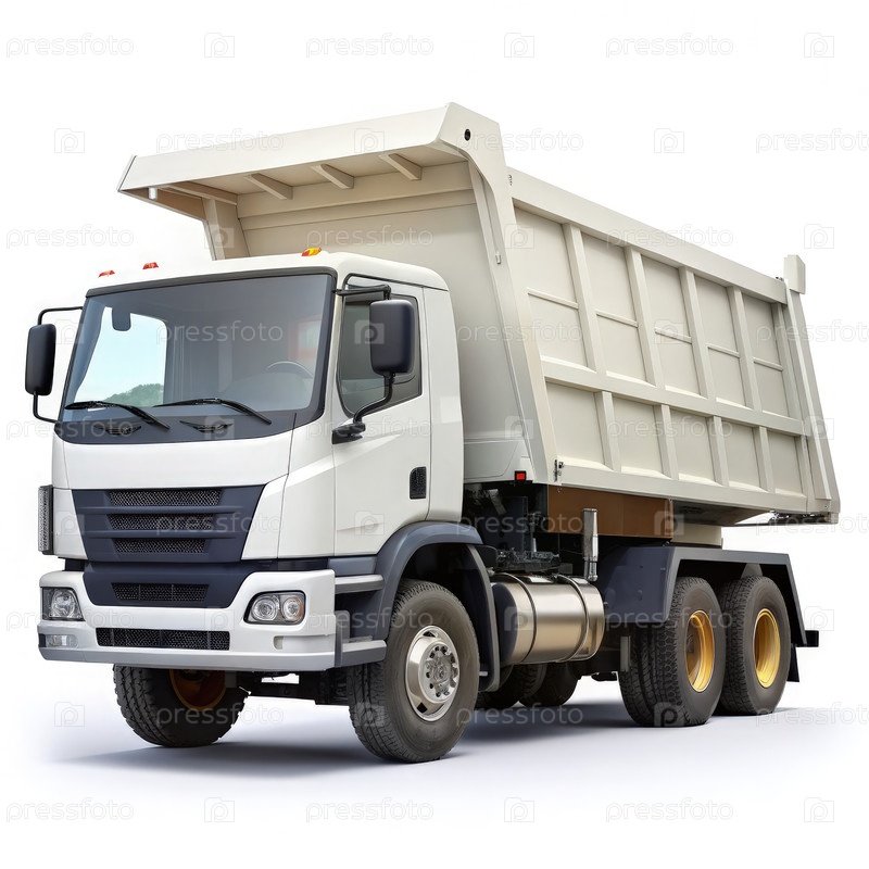 Белый грузовик с поднятой кроватью на белом фоне