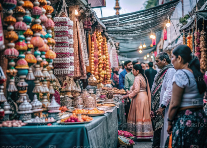 Вибрирующий рынок Дивали с красочными киосками и праздничным украшением