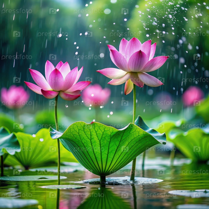Спокойный лотосовый пруд во время мягкого муссонного дождя с цветущими цветами