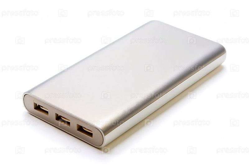 Портативный энергобанк с тремя портами USB на белом фоне