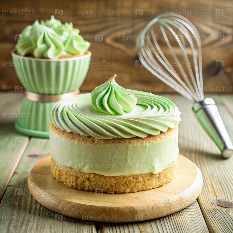 Красиво украшенный светло-зеленый сливочный торт в сопровождении соответствующего десерта и виска, отображаемый на деревянной поверхности в уютной обстановке