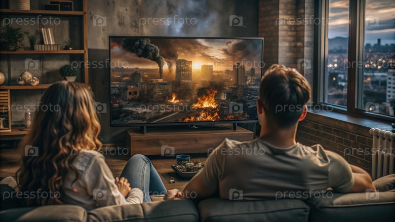 Пара смотрит на противоположные миры, разворачивающиеся по телевизору во время заката