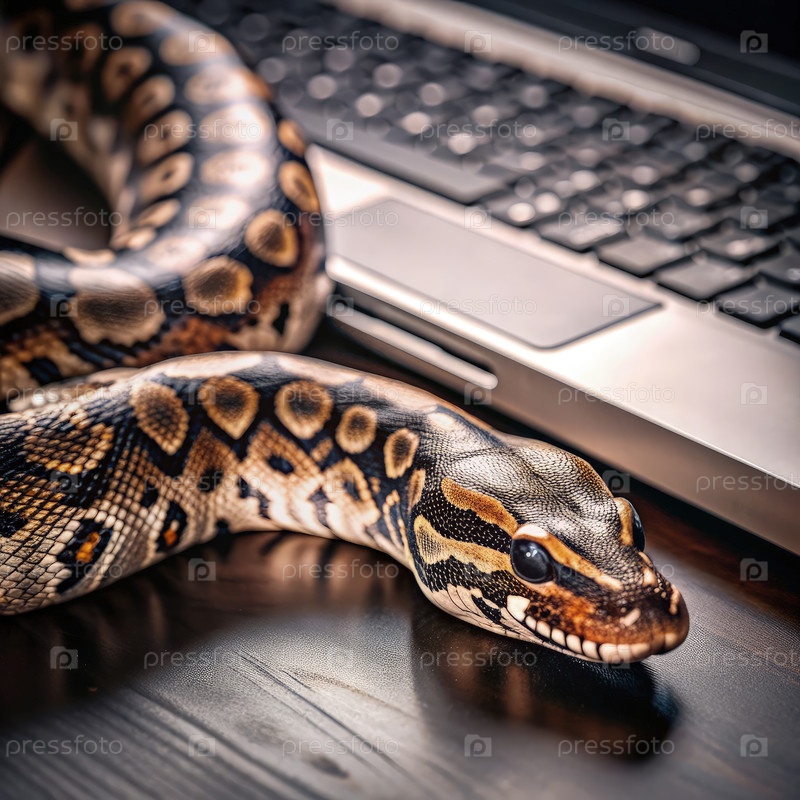 Змея-питон, отдыхающая рядом с ноутбуком на деревянном столе в течение дня