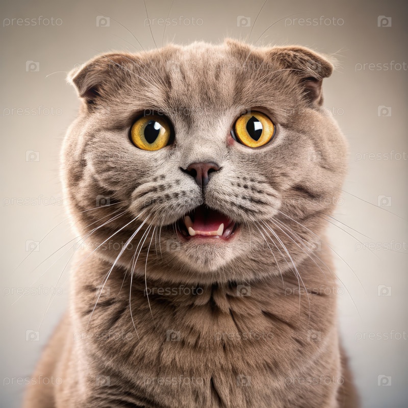 Шотландская кошка с радостным выражением лица на нейтральном фоне