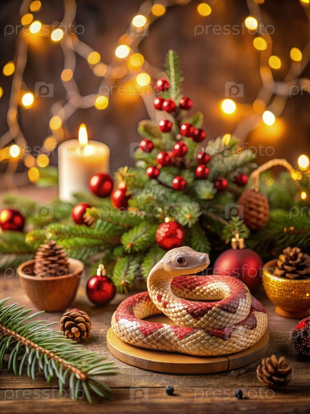 Сложная фигурка змеи, помещенная среди праздничных украшений и огней
