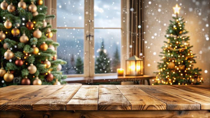 Пустой деревянный столешничный стол в уютной гостиной, украшенной для праздников