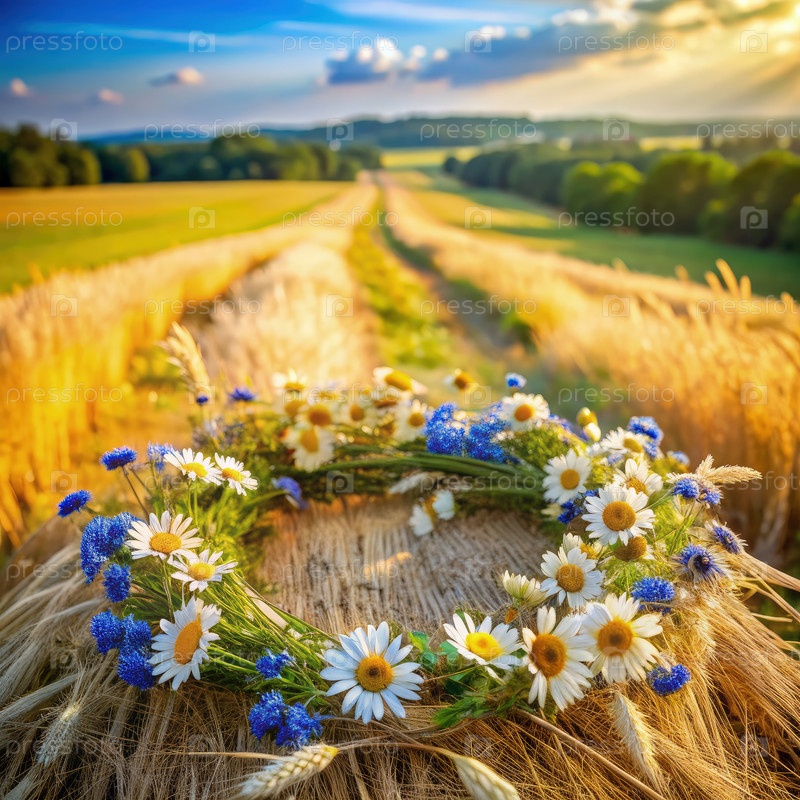 Летний венок из диких цветов, отдыхающих на золотой соломе на мирном поле
