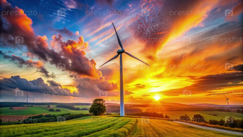 Ветряная турбина в силуэте от яркого заката солнца в сельском пейзаже