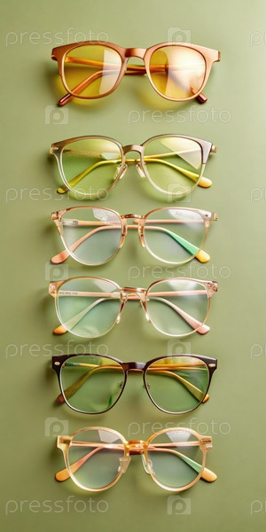 Коллекция стильных очков в различных цветах, отображаемых на зеленом фоне