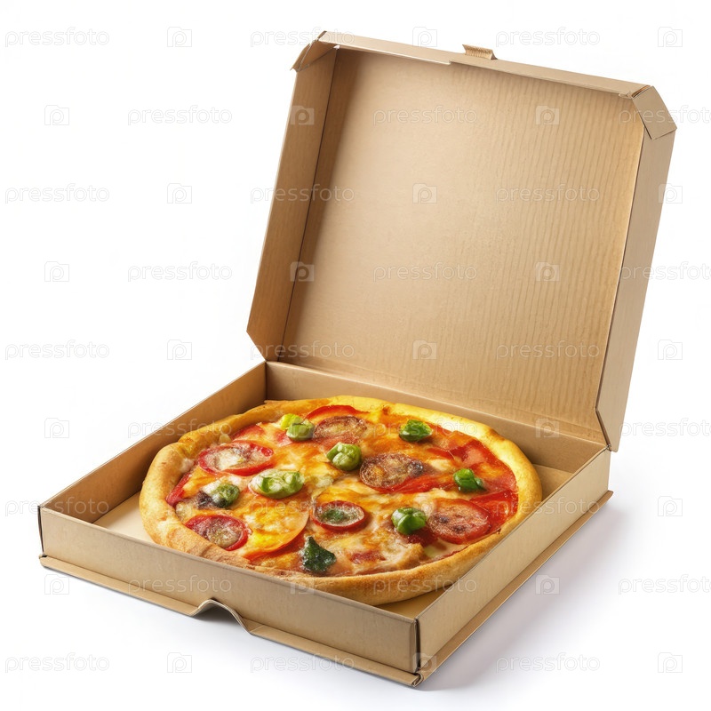 Свежевыпеченная пицца в открытой картонной коробке на белом фоне