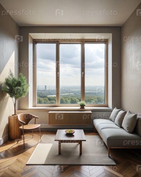 Уютная гостиная с большим окном, из которого открывается живописный вид