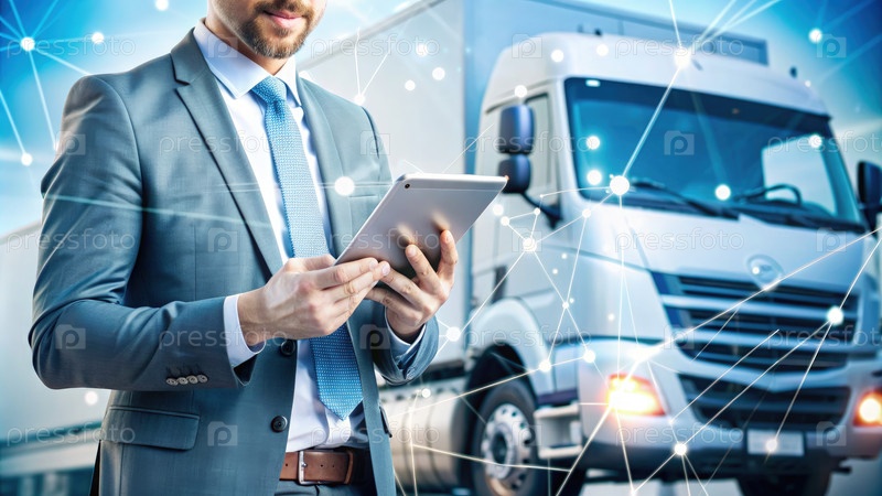 Бизнесмен, использующий планшет с транспортными грузовиками и самолетами на заднем плане