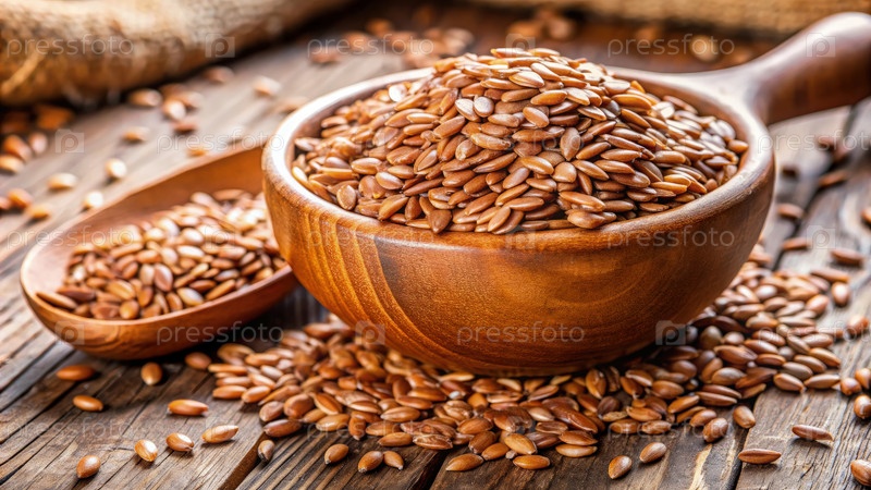 Свежесобранные семена льна в деревянных мисках на деревянной поверхности