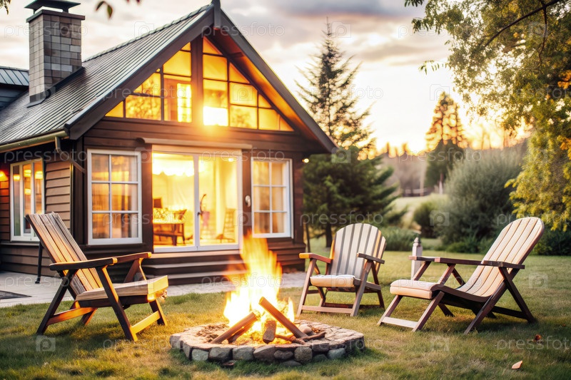 Уютный деревенский дворик с каминами и стульями на закате у хижины