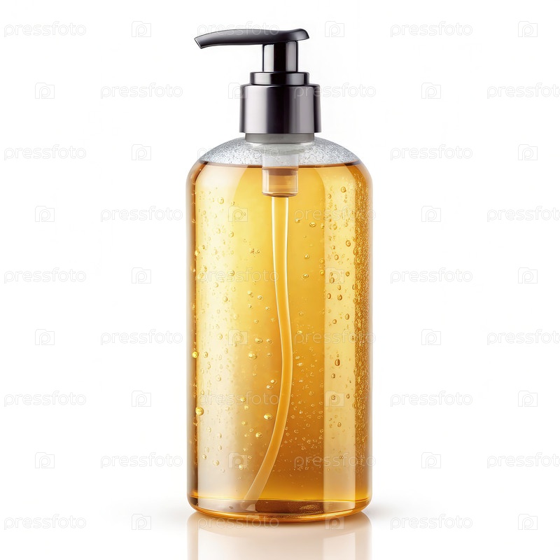 Гель для душа в прозрачной бутылке с насосом с золотой жидкостью на белом фоне