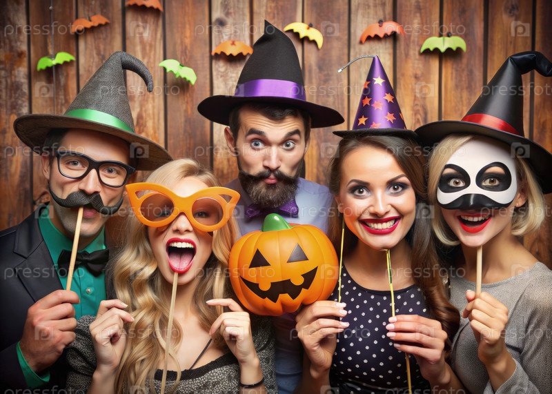 Фотошторы на тему Хэллоуина с друзьями, в которых представлены костюмы, реквизиты и декорации, сделанные на праздничном собрании в октябре
