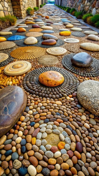 Декоративный путь, созданный с помощью различных цветных камней и галочек, демонстрируя сложные узоры в спокойной наружной обстановке днем