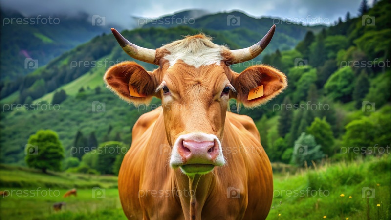 Коричневая корова стоит в пышном зеленом пастбище с горами на заднем плане