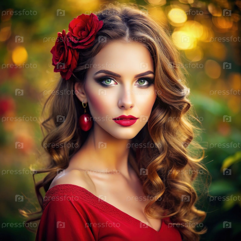 Молодая женщина с длинными волнистыми волосами, украшенные красными розами, захватывает золотой свет заката солнца в пышном саду и демонстрирует поразительную красоту в красном платье