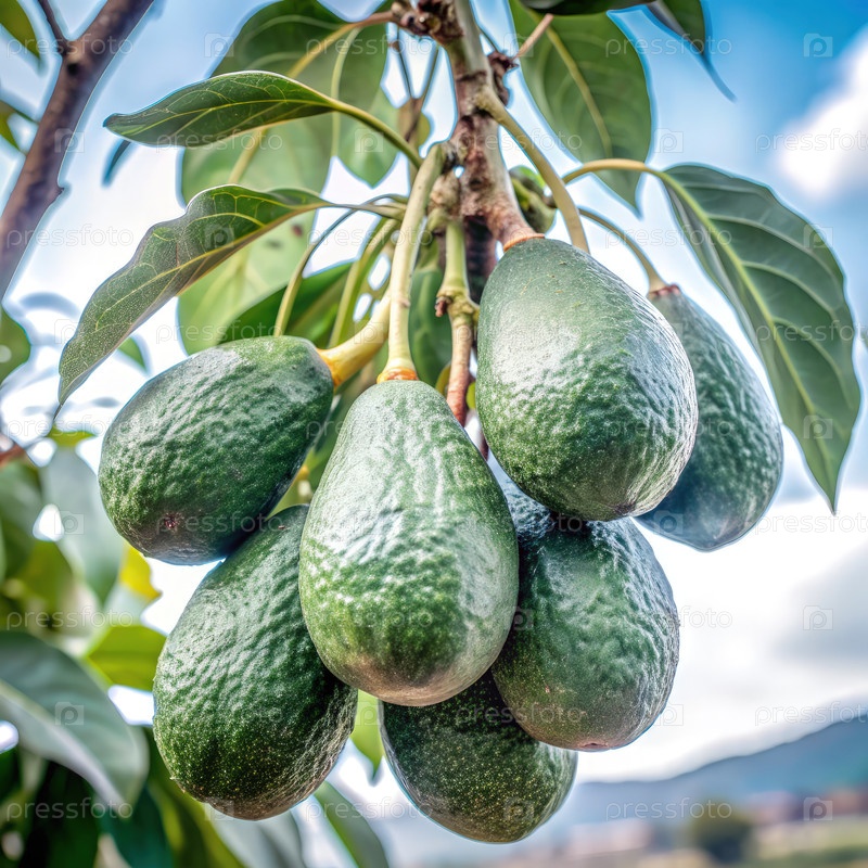 Свежие авокадо растут в изобилии на ветке дерева под ясным голубым небом в солнечном саду во время сезона сбора урожая