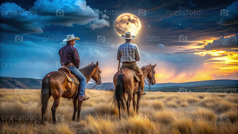 Два ковбоя, едущих на лошадях в прерии под лунным светом