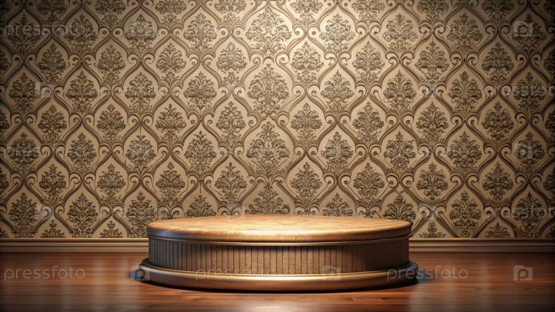 Винтажный округлый подиум с украшенными деталями, установленные на фоне сложно спроектированной обои в элегантном интерьере