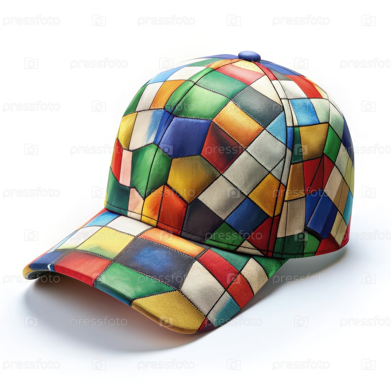 Шапка в стиле кубизма с красочными геометрическими узорами на белом фоне