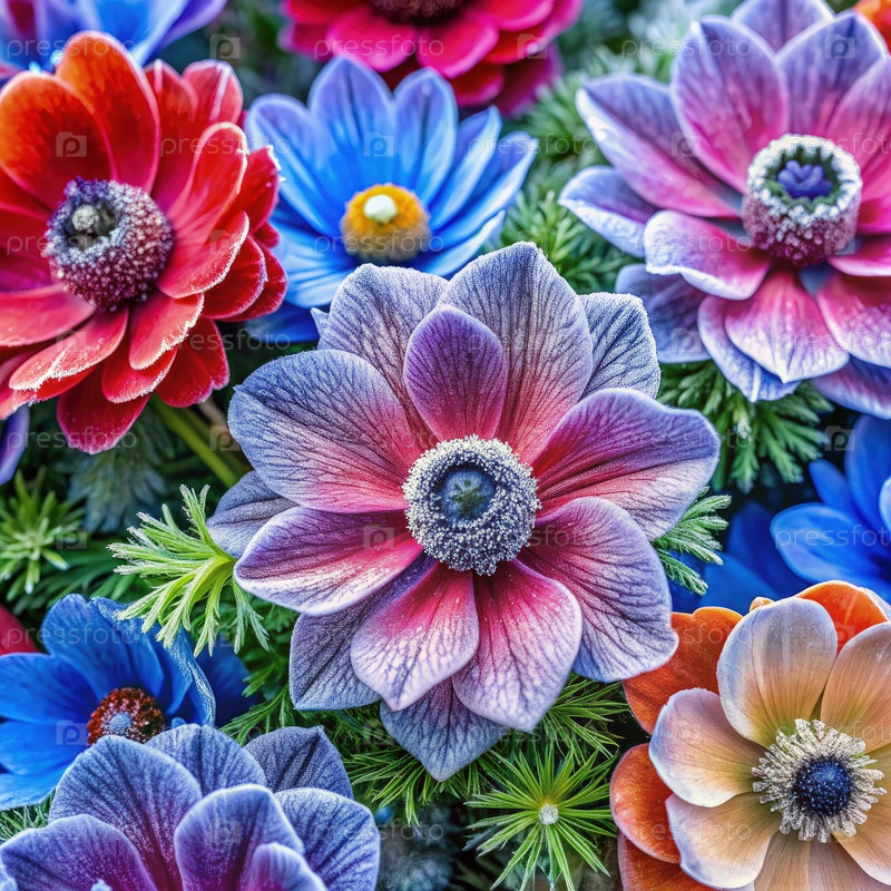 Яркие цветы анемоны в ярком дисплее, контрастирующем с блестящим морозом и льдом зимнего утра в спокойной садовой обстановке