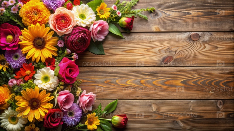 Живое расположение красочных цветов на деревянном фоне