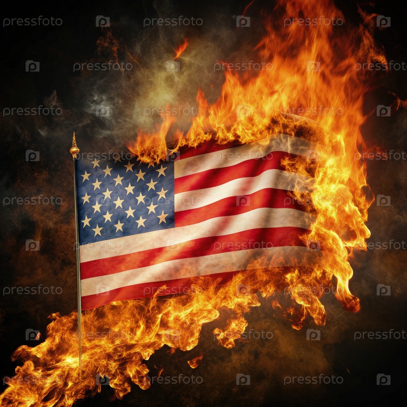 Горящий американский флаг, охваченный пламенем на темном фоне