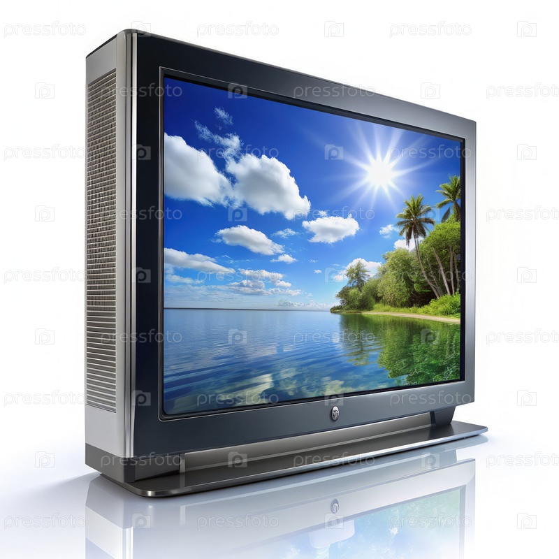 Современный телевизор, показывающий тропический пейзаж на белом фоне