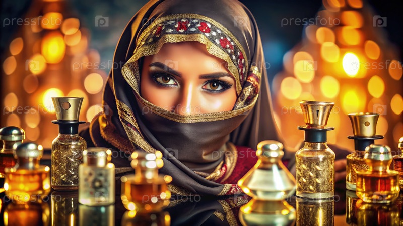 Потрясающий дисплей роскошных парфюмерий с элегантной женщиной в традиционной одежде на фоне арабского тематического фона во время вечерней атмосферы