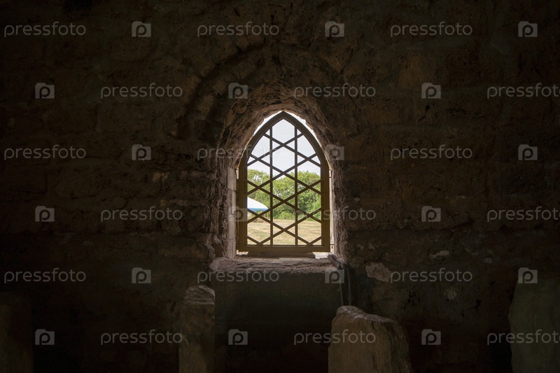 Окно с ромбовидной решеткой в древней каменной постройке