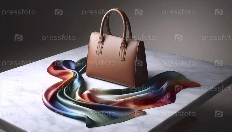 Шелковый шарф, связанный вокруг ручки классической кожаной сумочки, снятый на мраморной поверхности, Ай создал изображение
