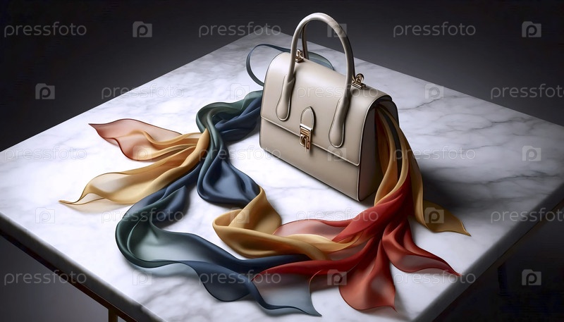 Шелковый шарф, связанный вокруг ручки классической кожаной сумочки, снятый на мраморной поверхности, Ай создал изображение