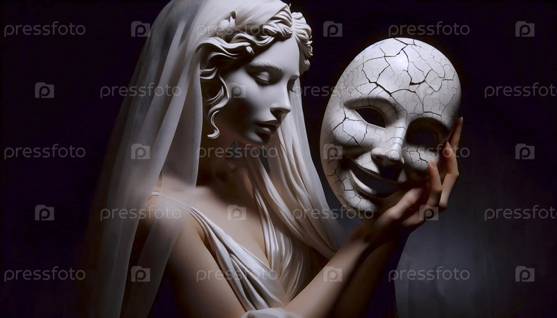 Танцовщица в платье греческого стиля, держащая большую треснувшуюся классическую маску над собственным лицом, Ай создала изображение