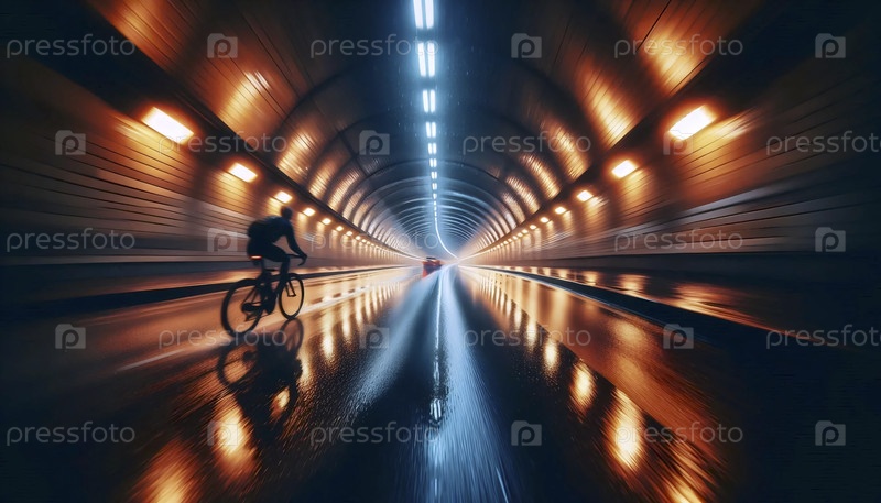 Одинокий велосипедист бежит ночью по длинному, залитому дождем туннелю, Ai generated image