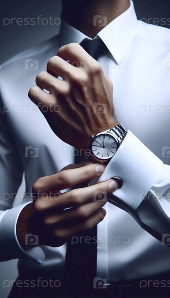 Ближайшее изображение часов на запястье мужчины, когда он регулирует кнопку наручников хрустящей белой рубашки, Ai generated image