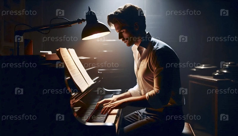 Композитор для фортепиано, лицо освещено одной настольной лампой, ноты в тени, Ai generated image