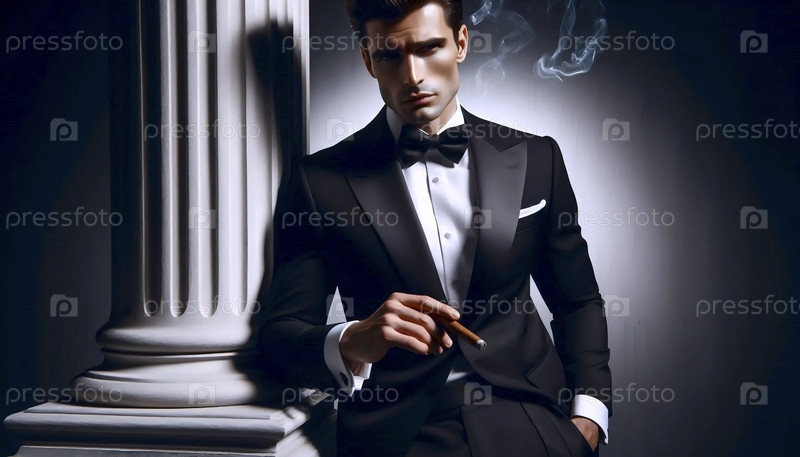 Харизматичный актер в индивидуальном смокинге, опирающийся на столб с одной рукой в кармане, Ай создал образ