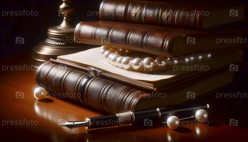 Шнурок жемчуга, застрявший на страницах кожаной книги на столе, Ай создал изображение