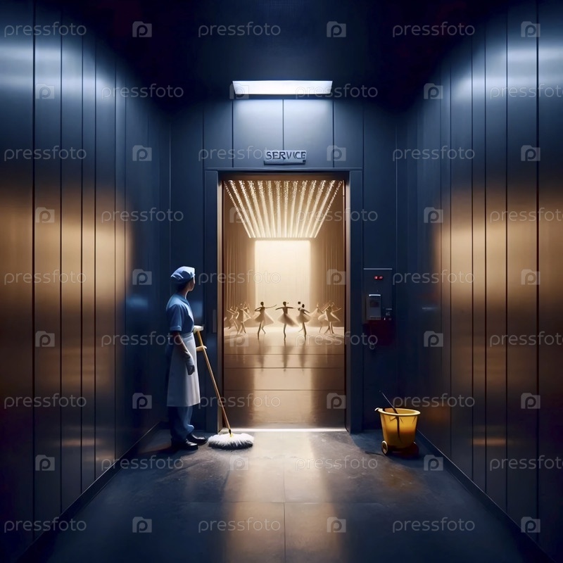 Уборщица ночной смены останавливается, чтобы посмотреть на репетицию балета через заднюю дверь театра