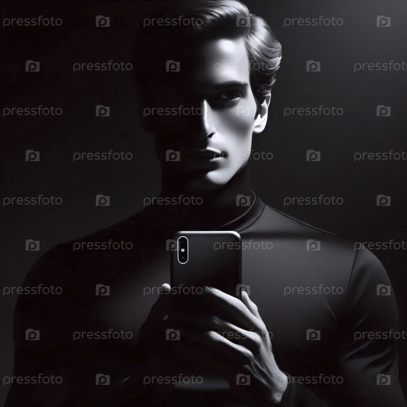 Технологический провайдер в черном гардеробе, освещенный драматическим chiaroscuro, элегантное устройство в руке, Ai создал изображение