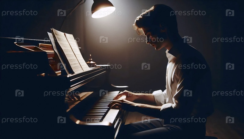 Композитор для фортепиано, лицо освещено одной настольной лампой, ноты в тени, Ai generated image