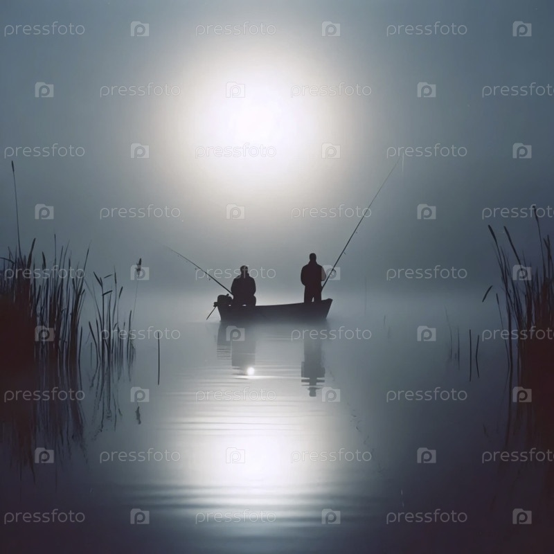 Спокойный момент, когда отец и маленький ребенок ловят рыбу у причала на тихом озере, ранний утренний туман поднимается, Ai создал изображение