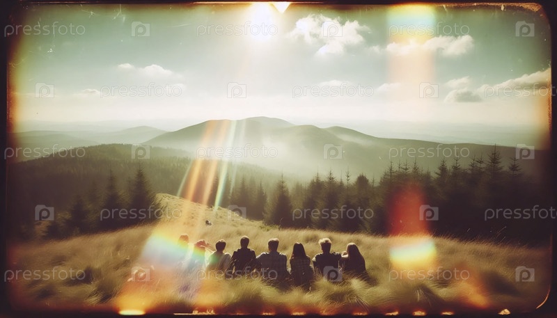 Группа друзей на пешеходной дорожке, останавливающихся за выпивкой в столовой, с обширным живописным видом позади них слегка переосмысленный, Ай создал изображение